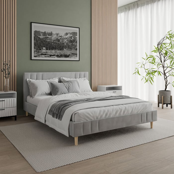 The JAXON bed is the perfect blend of contemporary design and practical comfort. Its minimalist silhouette, upholstered finish, and soft, vertical-stitched headboard create a timeless look that suits both modern and classic interiors. The bed stands on tall, natural wooden legs, which give it a light, airy appearance and make cleaning underneath easy – a stylish and functional detail that sets Jaxon apart.