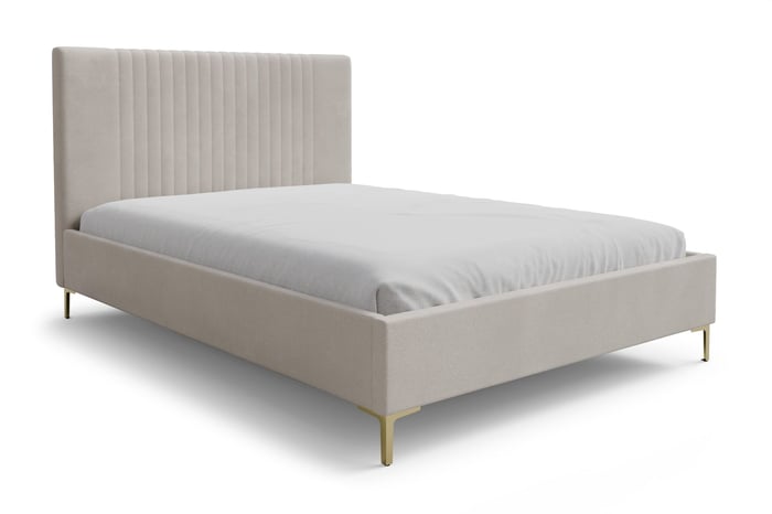 LIAM light beige upholstered bed with tall stitched headboard, slim gold legs and modern design. Durable, easy to clean, perfect for UK bedrooms. The LIAM is available in three standard UK sizes – Double, King, and Super King – ensuring the perfect fit for any bedroom space. It also comes in two timeless colour options: elegant grey and soft light beige.