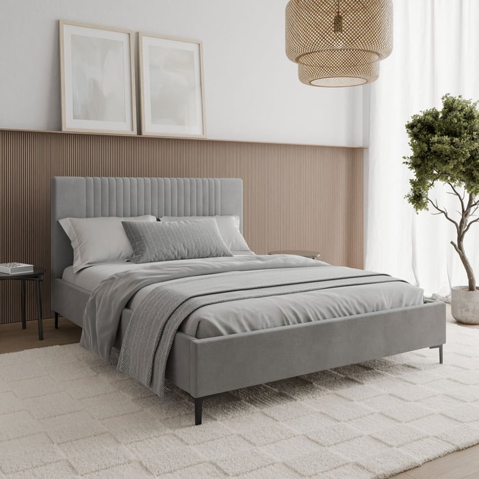 The LIAM Bed is built on a sturdy wooden frame, upholstered in high-quality grey fabric for a timeless and versatile look. The tall, vertically stitched headboard gives the bed a modern, elegant appearance while also providing excellent comfort when sitting up. Slim black metal legs elevate the frame, ensuring stability and adding a contemporary touch to your bedroom décor.