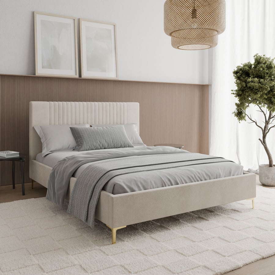 LIAM light beige upholstered bed with tall stitched headboard, slim gold legs and modern design. Durable, easy to clean, perfect for UK bedrooms. The LIAM is available in three standard UK sizes – Double, King, and Super King – ensuring the perfect fit for any bedroom space. It also comes in two timeless colour options: elegant grey and soft light beige.