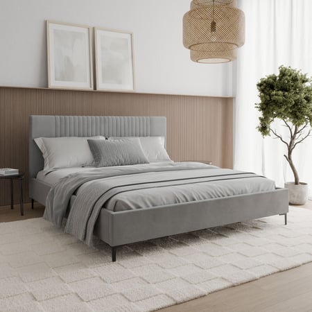 The LIAM Bed is built on a sturdy wooden frame, upholstered in high-quality grey fabric for a timeless and versatile look. The tall, vertically stitched headboard gives the bed a modern, elegant appearance while also providing excellent comfort when sitting up. Slim black metal legs elevate the frame, ensuring stability and adding a contemporary touch to your bedroom décor.
