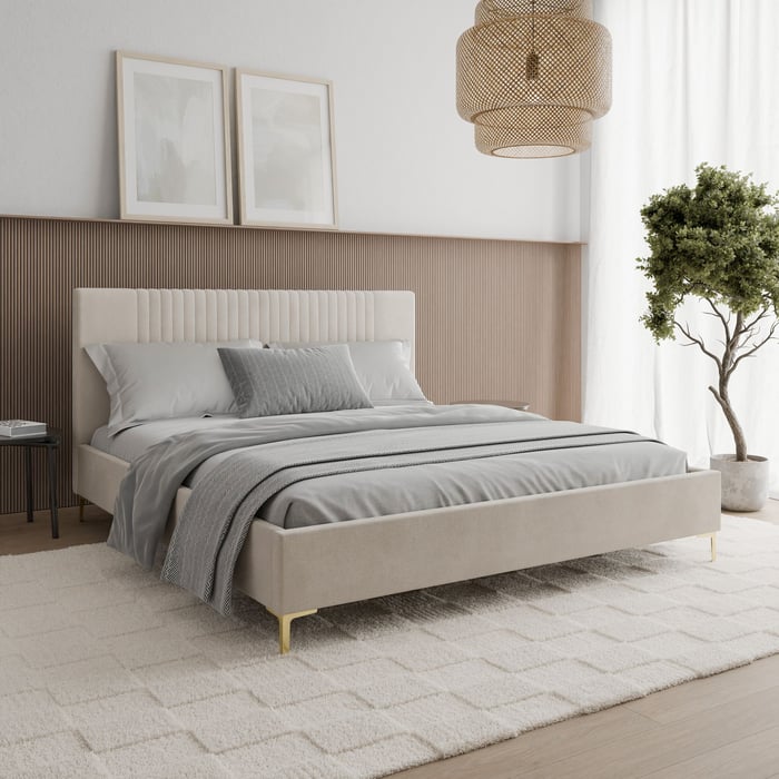 LIAM light beige upholstered bed with tall stitched headboard, slim gold legs and modern design. Durable, easy to clean, perfect for UK bedrooms. The LIAM is available in three standard UK sizes – Double, King, and Super King – ensuring the perfect fit for any bedroom space. It also comes in two timeless colour options: elegant grey and soft light beige.