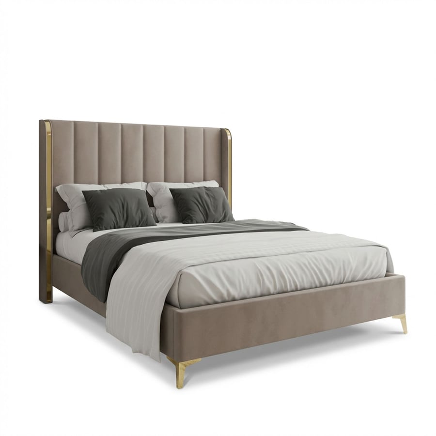 The WILLIAM bed features a tall, vertical-stitched headboard with striking golden accents on the edges, creating a bold and refined design. The sturdy construction includes a durable metal frame with solid wooden slats for long-lasting support. Upholstered in soft-touch fabric, this bed offers both comfort and elegance while being easy to maintain.