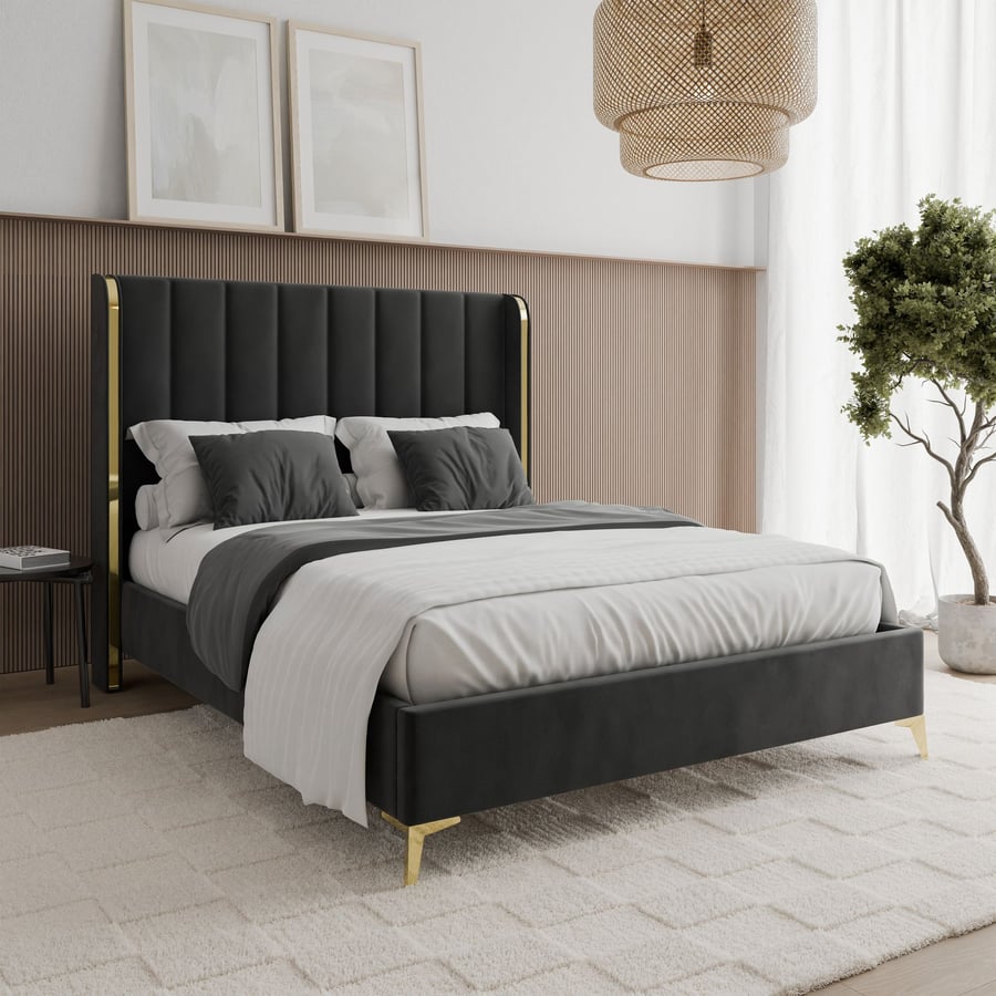 WILLIAM upholstered bed in black, king size with vertical stitched headboard & gold accents.