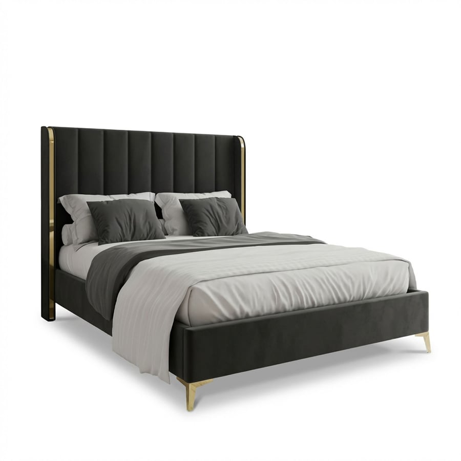 The WILLIAM bed features a tall, vertical-stitched headboard with striking golden accents on the edges, creating a bold and refined design. The sturdy construction includes a durable metal frame with solid wooden slats for long-lasting support. Upholstered in soft-touch fabric, this bed offers both comfort and elegance while being easy to maintain.