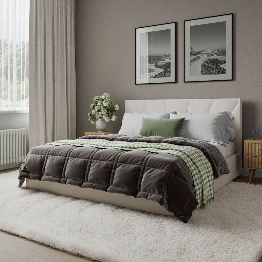 The DYLAN bed combines contemporary design with everyday functionality, creating a perfect centrepiece for any stylish bedroom. Its distinctive headboard with fan-shaped stitching adds a luxurious touch, while the soft velvet upholstery ensures comfort and sophistication. Available in two timeless colours – cream and grey – the DYLAN bed blends seamlessly into modern, minimalist and glamorous interiors.