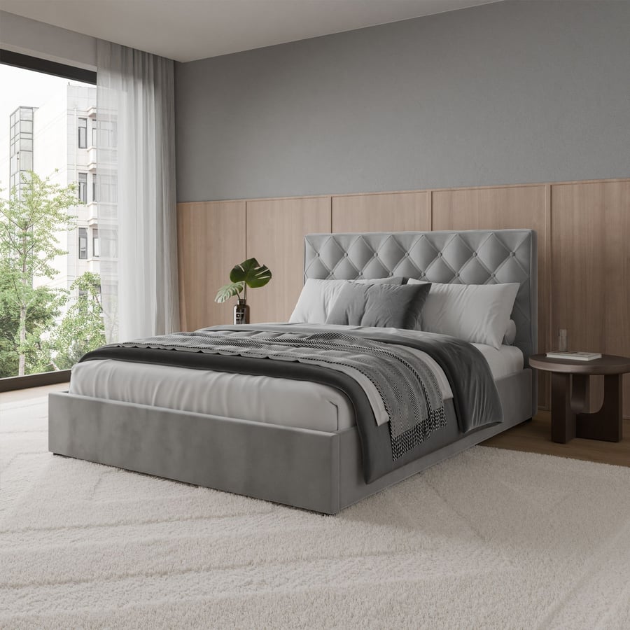 ETHAN fabric bed frame grey in king size with lift-up storage and deeply tufted, button-stitched headboard.