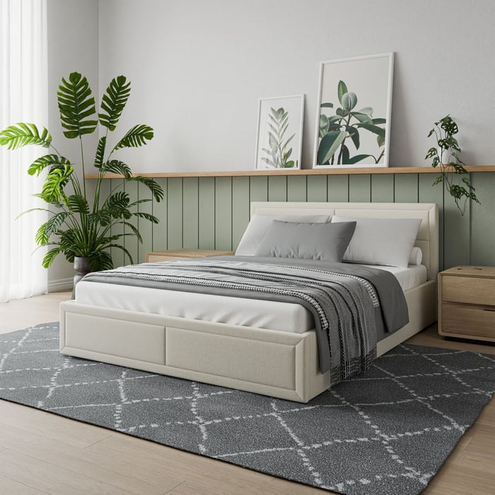 A large storage compartment hidden beneath the mattress offers convenient space for bedding, blankets, or seasonal textiles. Access is made easy thanks to a gas-lift mechanism that ensures smooth and effortless opening.