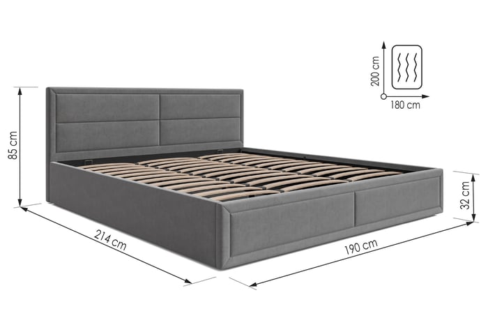 A large storage compartment hidden beneath the mattress offers convenient space for bedding, blankets, or seasonal textiles. Access is made easy thanks to a gas-lift mechanism that ensures smooth and effortless opening.