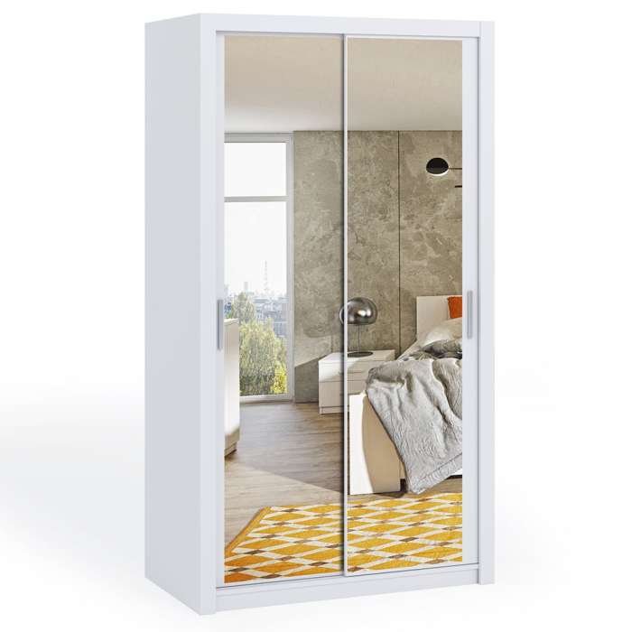The BONITO 120cm Wardrobe in White is a compact and stylish storage solution, perfect for modern living spaces. Crafted from 16mm laminated chipboard, it offers durability and a smooth finish that resists wear. The wardrobe features 2 sliding doors with full-length mirrors, designed for easy access while saving space and adding functionality. Its elegant white finish adds a bright and sophisticated touch, making it a versatile addition to any room.