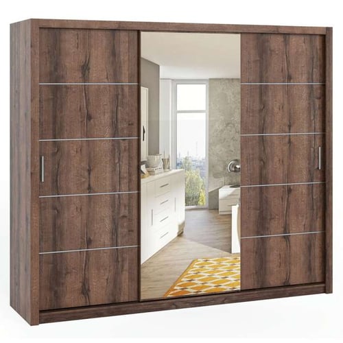 The BONITO 250cm Wardrobe in Oak Monastery is a compact and stylish storage solution, perfect for modern living spaces. Crafted from 16mm laminated chipboard, it offers durability and a smooth finish that resists wear. The wardrobe features 3 sliding doors with full-length mirror on the middle door, designed for easy access while saving space and adding functionality. Its elegant oak monastery finish adds a warm and sophisticated touch, making it a versatile addition to any room.