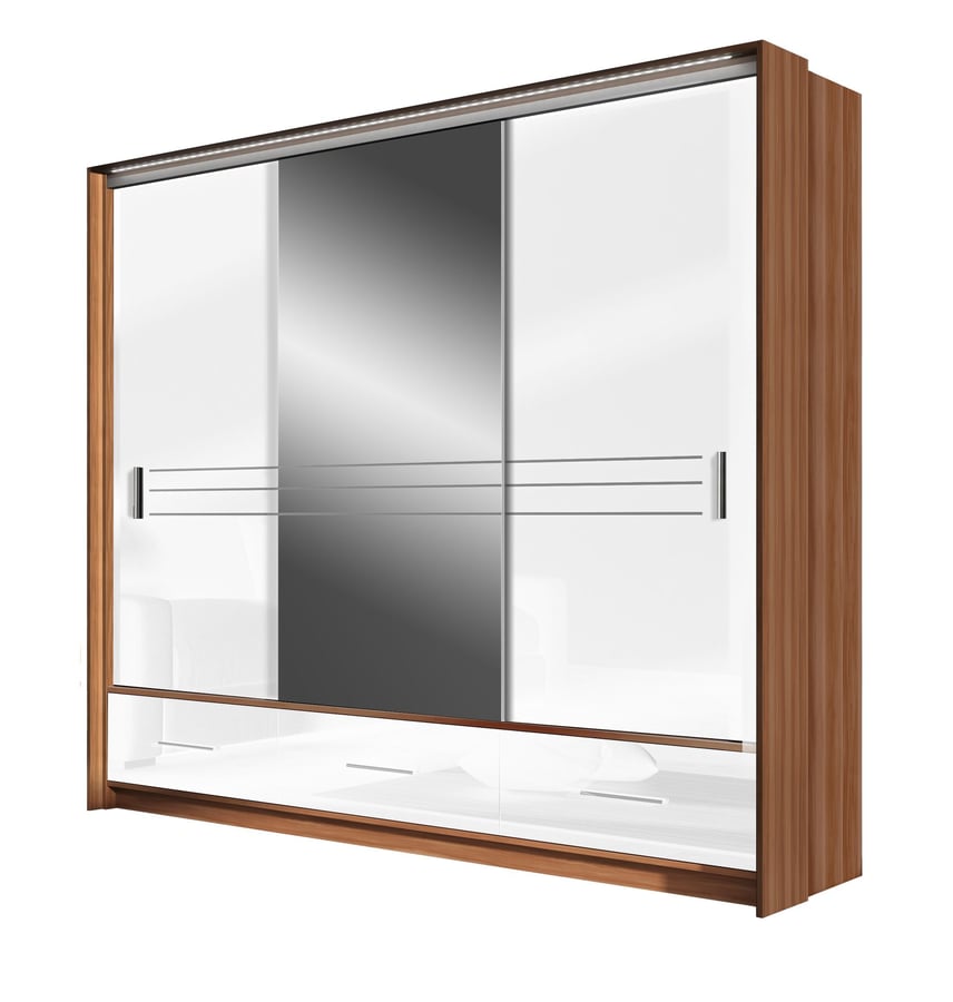 Stylish wardrobe with mirrored door, LED lighting, 3 drawers, 5 shelves, 2 hanging rails, and durable 16 mm laminated chipboard construction.