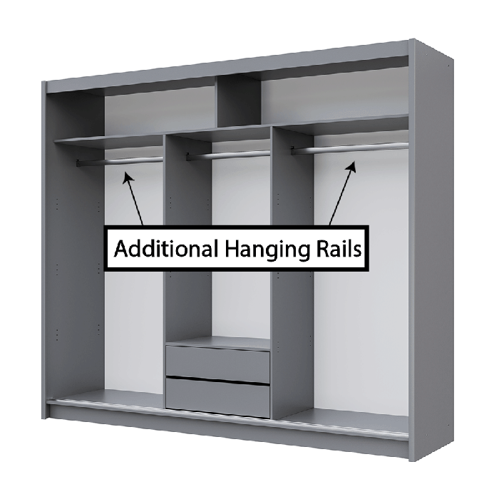 With the sliding door ARUBA 2 250cm wardrobe you have multiple choices. Just add 1 or 2 additional hanging rails and configure the storage to your hearts content. Go for a third of the wardrobe as shelves or go for all hanging storage. Plus, choose where to put the shelves: on the left or the right.