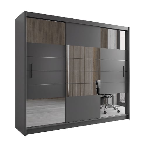 The ARUBA 2 250cm wardrobe in graphite features a modern design with three smooth sliding doors, accented by stylish mirrored sections. Crafted from durable 16mm laminated chipboard and finished with sleek matt-silver handles, this wardrobe combines practicality and elegance, making it a standout addition to any space.