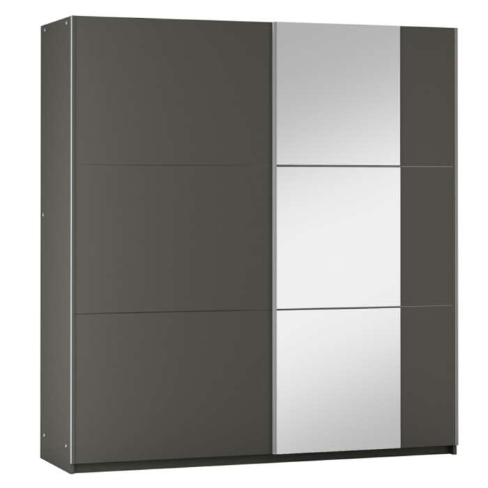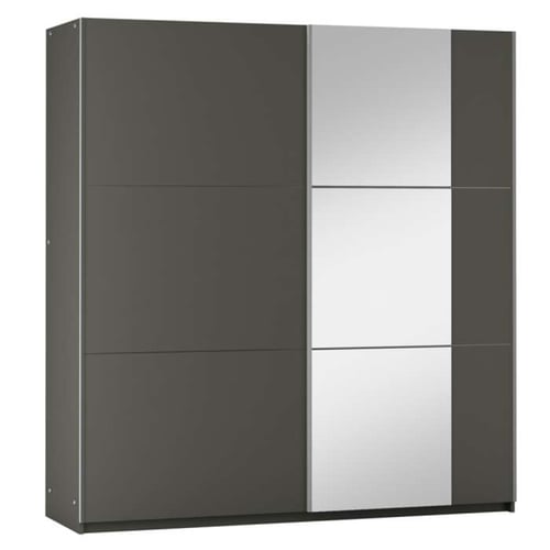 The BASTIA graphite wardrobe features 2 sliding doors, with one door designed with 3 mirror panels to create a full-length mirror. Made from durable 16mm laminated chipboard, this wardrobe combines functionality and a sleek, modern look, perfect for any bedroom.