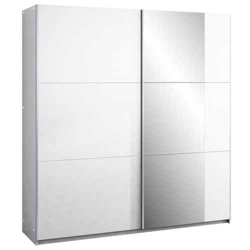 The BASTIA white wardrobe features 2 sliding doors, with one door designed with 3 mirror panels to create a full-length mirror. Made from durable 16mm laminated chipboard, this wardrobe combines functionality and a sleek, modern look, perfect for any bedroom.