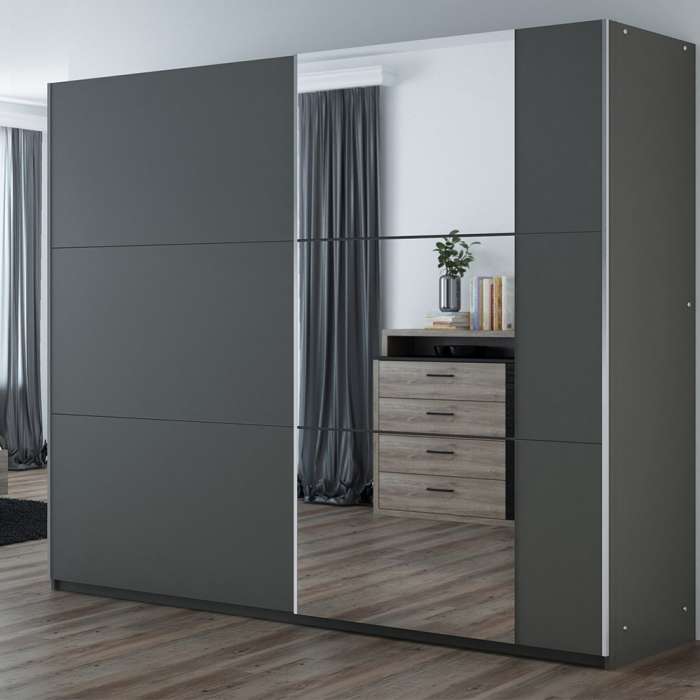 The BASTIA 250cm graphite mirrored sliding door wardrobe features a sleek design, and offers practical storage and a touch of elegance to any room.