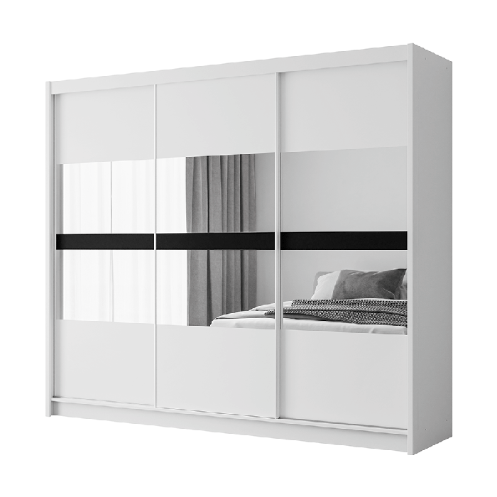 The BATUMI 250cm wardrobe in white offers a modern and elegant design, featuring three sliding doors with mirrored panels divided by a stylish black stripe for a striking contrast. Built with 16mm laminated chipboard, it ensures durability and long-lasting use. The doors glide smoothly on aluminium rails, providing effortless access to the wardrobe's spacious interior. Perfect for adding both functionality and sophistication to any bedroom.