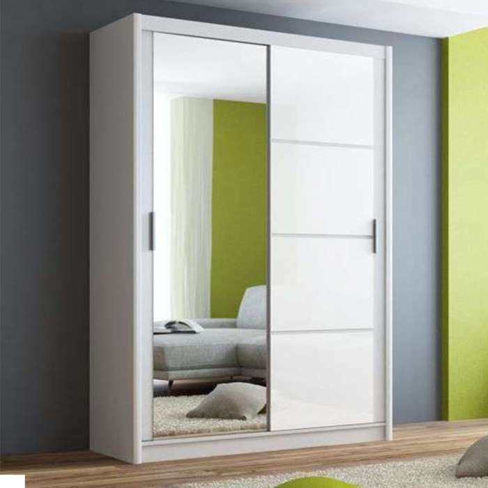 The BRANDON 150cm white sliding door wardrobe features a sleek mirrored door and a white glass door, offering a modern and stylish look. Inside, it provides 5 shelves and a hanging rail, delivering practical storage for your clothing and accessories.