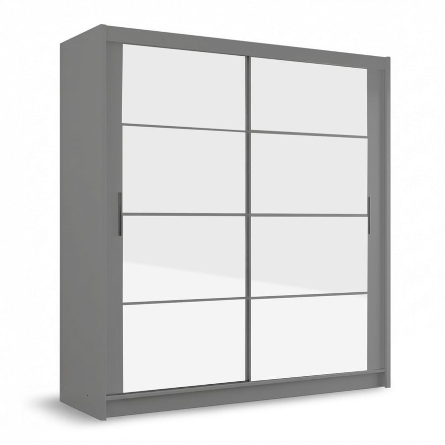 The sliding door wardrobe DAKOTA 203cm is made from high-quality laminated board that is durable and easy to clean. Each door has 4 mirrored panels that adds light and elegance to your room and silver plastic handles that are stylish and convenient. The back of the wardrobe is made of HDF board, which adds stability and strength to the structure. You can also add the single LED to your wardrobe.