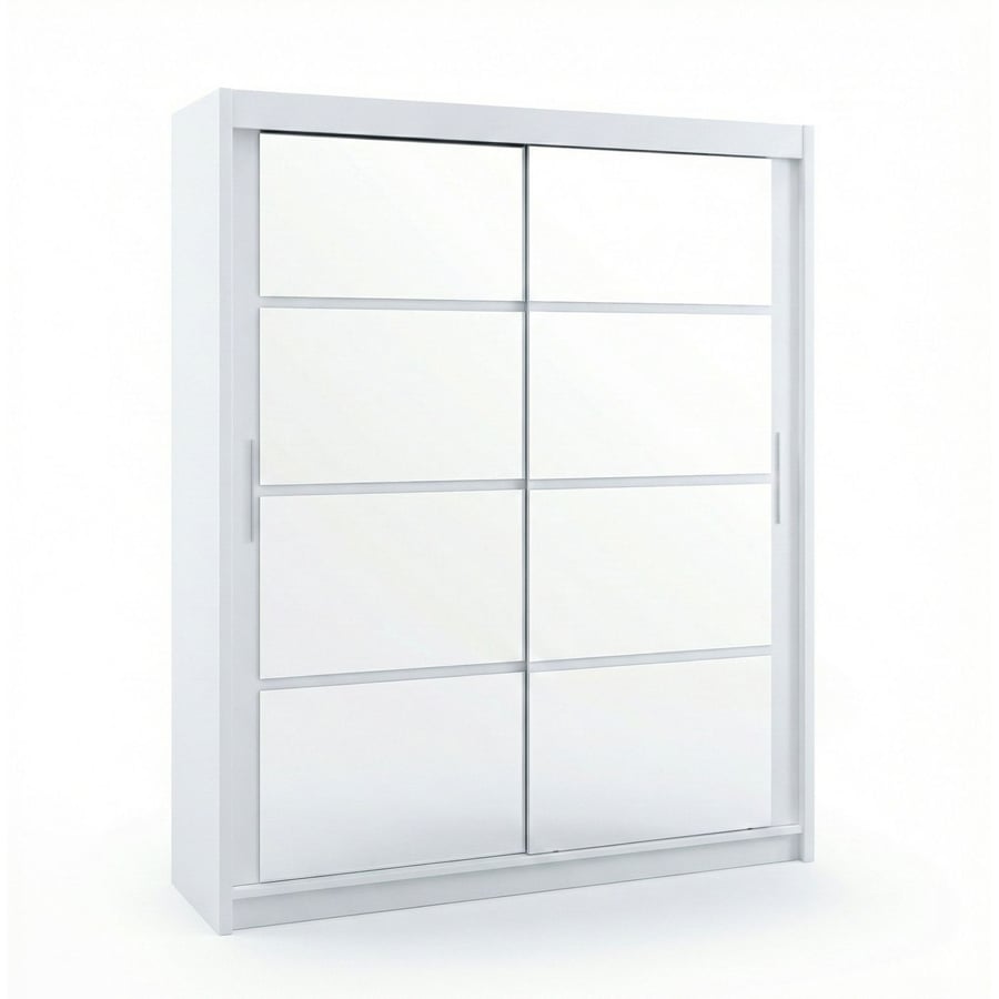 The sliding door wardrobe DAKOTA 160cm is made from high-quality laminated board that is durable and easy to clean. Each door has 4 mirrored panels that adds light and elegance to your room and silver plastic handles that are stylish and convenient. The back of the wardrobe is made of HDF board, which adds stability and strength to the structure. You can also add the single LED to your wardrobe.