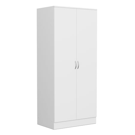 The ESSENTIAL wardrobe has 2 hinged doors, a top shelf, hanging rail, fronts made from matte laminated chipboard and stylish silver handles.