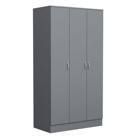 The ESSENTIAL wardrobe is a sleek, space-saving solution featuring three hinged doors, 5 shelves, and a hanging rail for organised storage. Made from high-quality laminated board with matte-finished fronts, it’s finished with silver curved handles and sturdy plastic feet—perfect for modern interiors.