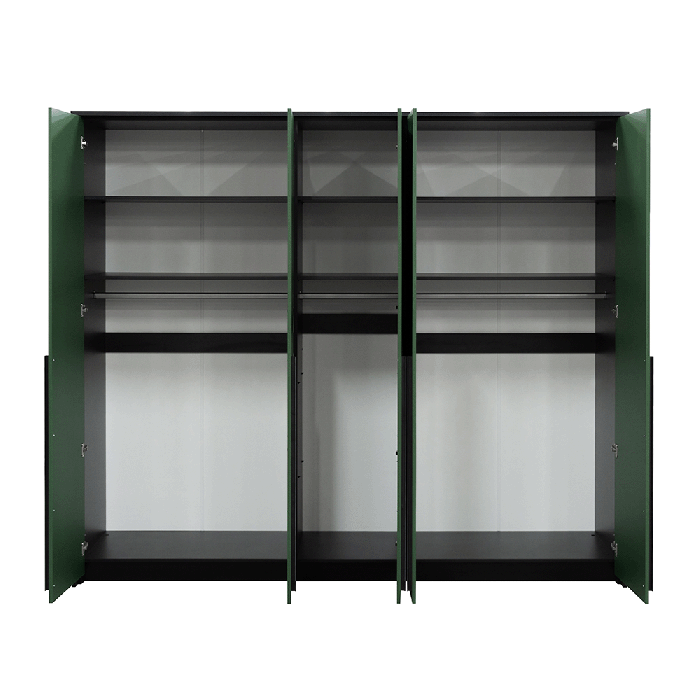 The GENUA 255 wardrobe in black / bottle green is a pinnacle of modern design and functionality, offering extensive storage solutions with a sleek, contemporary aesthetic. With an impressive width of 255 cm, this wardrobe is designed to meet the demands of a busy lifestyle while enhancing the elegance of your bedroom.
