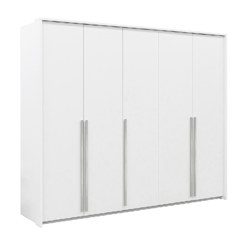 This wardrobe features five hinged doors, each fitted with long, elegant handles that add a touch of sophistication and ensure effortless access to its contents. Crafted with precision and high-quality 16mm laminated chipboard, the GENUA 255 wardrobe combines durability with a modern design. Its clean lines and minimalist style make it a versatile addition to any bedroom décor, seamlessly blending with various interior styles. The robust construction ensures that this wardrobe will stand the test of time, providing a long-lasting storage solution.