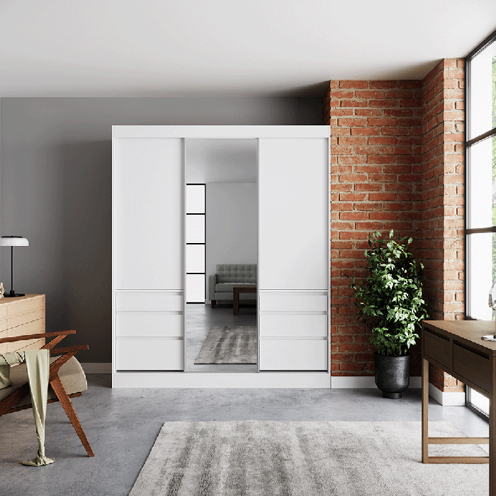 The HAIDAR 180 wardrobe offers sleek style and practical storage. In crisp white, it features 3 sliding doors, 1 with a full-length mirror. Inside are 4 shelves, 2 hanging rails, and 6 drawers in varying sizes, perfect for organising clothes and accessories. Durable and modern, it’s ideal for any bedroom.