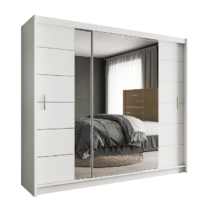 The wardrobe features three stylish sliding doors: one with a full-length mirror for added functionality, and the other two adorned with part mirror and five elegant strips for a modern touch. Designed for convenience and aesthetic appeal, its smooth sliding mechanism ensures easy access while enhancing your room's contemporary look.