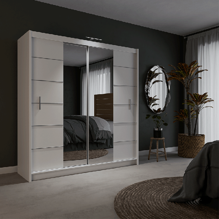 Elevate your bedroom with the LIZBONA 2 203cm Sliding Door Wardrobe, the perfect blend of style and functionality. Its sleek white finish and mirrored doors create a modern and spacious feel, while the thoughtfully designed interior provides ample storage with shelves and hanging rails. Customise it to suit your needs with optional small hanging rails and optional single or double LED lights for added elegance and convenience. Don’t miss the chance to bring home this versatile wardrobe that combines practicality, contemporary design, and personalised features to transform your space today!