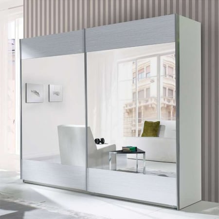 The LUX STRIPES wardrobe offers style and functionality with its sleek white finish, 2 mirrored sliding doors, 9 shelves, and a hanging rail. Perfect for modern homes!