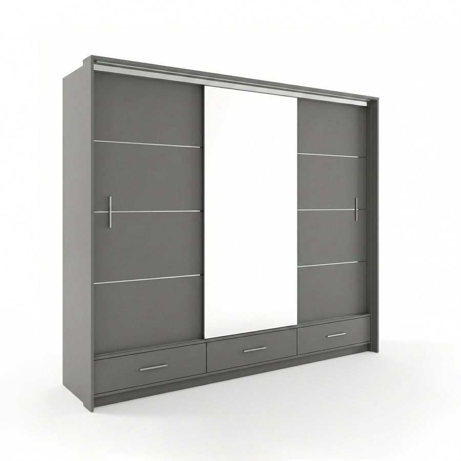 The MARSYLIA 255cm Sliding Door Wardrobe in graphite is a stylish and practical addition to any bedroom. It features 3 sliding doors, with 1 full-length mirror on one door, perfect for enhancing the sense of space and light in your room. Made from high-quality 16mm laminated chipboard.