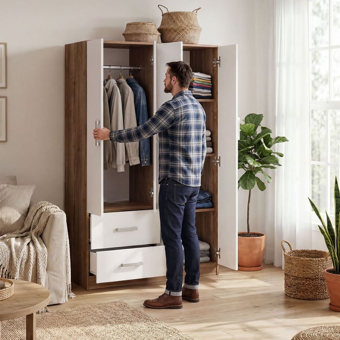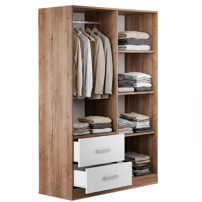 The OAKRIDGE wardrobe has been carefully planned to maximise usability. Inside, you’ll find a well-structured layout featuring a hanging rail, four shelves and two drawers. This combination allows you to neatly organise everything from bulky knitwear to everyday essentials, keeping your wardrobe tidy and easy to navigate.
