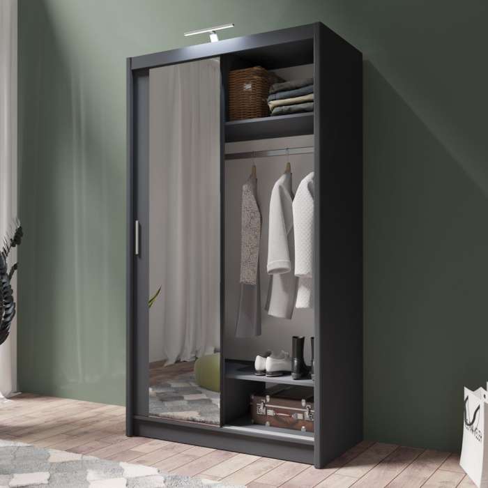 The PARIS 120cm graphite wardrobe features 2 full-length mirrored sliding doors on durable aluminium rails and is constructed from 16mm laminated chipboard for long-lasting quality. An optional single LED light can be purchased when ordering, which can be added to enhance the wardrobe’s top for a stylish touch.