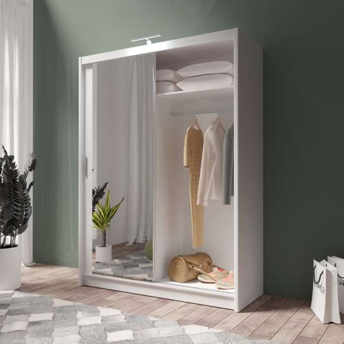 The PARIS 160cm black wardrobe features 2 full-length mirrored sliding doors on durable aluminium rails and is constructed from 16mm laminated chipboard for long-lasting quality. An optional single LED light can be purchased when ordering, which can be added to enhance the wardrobe’s top for a stylish touch.