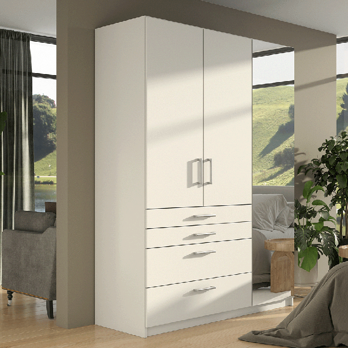 The wardrobe features three hinged doors, with one door beautifully mirrored to add a touch of contemporary style and functionality. The mirrored door not only enhances the aesthetic appeal but also provides a convenient full-length reflection, making it perfect for dressing and grooming.