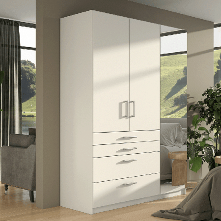 For enhanced organization, the wardrobe boasts four drawers, perfect for storing smaller essentials and keeping them easily accessible. The top drawer is particularly unique, featuring partition dividers that allow for organized storage of smaller items, such as jewellery, ties, or undergarments.