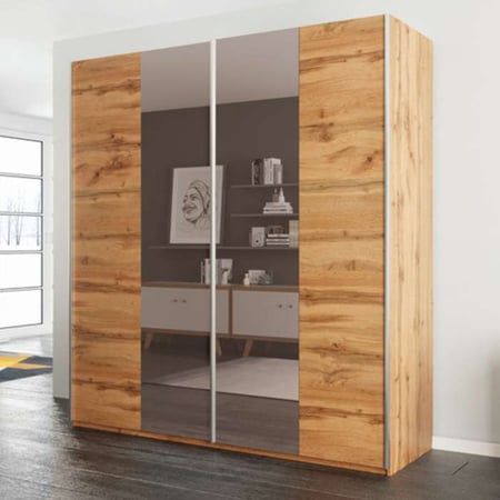 The PRAGA 200cm Wardrobe in oak wotan is a perfect blend of modern design and functionality. Featuring 2 sliding doors, it saves space while offering easy access to your belongings. Each door is adorned with a full-length mirror on half, adding elegance to your room while enhancing light and creating a spacious feel. Crafted from 16mm laminated chipboard, this wardrobe is sturdy and durable, designed to withstand daily use. The long matt-silver handles provide a sleek touch, complementing the contemporary aesthetic. Ideal for any bedroom or dressing area, the PRAGA wardrobe combines style and practicality, ensuring your space stays organised and chic.
