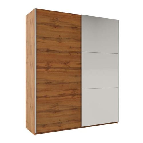 The RODOS 200cm wardrobe in oak wotan combines functionality with modern elegance. It features 2 sliding doors, one of which boasts a full-length mirror, perfect for enhancing your room's light and space while offering a practical dressing solution. Both doors are adorned with two sleek horizontal lines for a stylish touch. Crafted from 16mm high-quality laminated chipboard, this wardrobe is durable and designed to withstand daily use. Its spacious interior ensures ample storage for clothes, accessories, and more, making it a chic and practical addition to any bedroom.