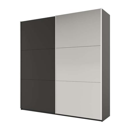 The RODOS 225cm wardrobe in graphite combines functionality with modern elegance. It features 2 sliding doors, one of which boasts a full-length mirror, perfect for enhancing your room's light and space while offering a practical dressing solution. Both doors are adorned with two sleek horizontal lines for a stylish touch. Crafted from 16mm high-quality laminated chipboard, this wardrobe is durable and designed to withstand daily use. Its spacious interior ensures ample storage for clothes, accessories, and more, making it a chic and practical addition to any bedroom.