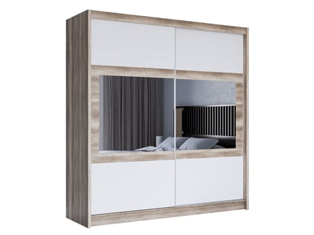 The SALWADOR 203cm Sliding Door Wardrobe in oak canyon and white combines modern elegance with practical storage. Featuring 2 sliding doors with horizontal mirrors, it adds style and functionality to your space. Inside, 8 spacious shelves and 2 hanging rails provide ample room to organise your clothing and accessories with ease.