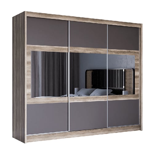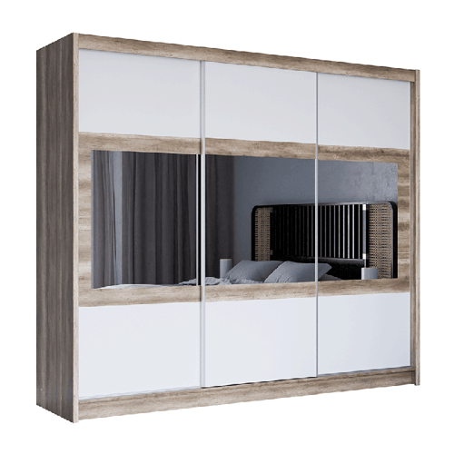 This wardrobe features three sliding doors, each adorned with a horizontal mirrored panel with an oak canyon frame, that adds a touch of elegance while creating a sense of spaciousness in your room.