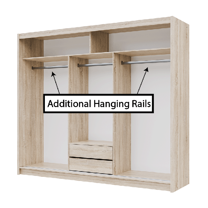 With the sliding door SEWILLA 250cm wardrobe you have multiple choices. Just add 1 or 2 additional hanging rails and configure the storage to your hearts content. Go for a third of the wardrobe as shelves or go for all hanging storage. Plus, choose where to put the shelves: on the left or right side. Please note that the top shelves are fixed and cannot be removed.