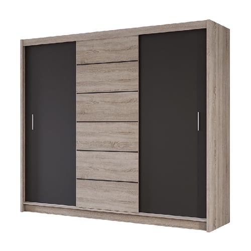 The SEWILLA 250 cm wardrobe, is a perfect blend of style and functionality, designed to elevate the look of any bedroom. Its contemporary design features three sliding doors, with two doors in a sophisticated lava (grey/brown) colour and the other, along with the wardrobe's body, in a warm oak sonoma finish. The oak sonoma door is further enhanced by five horizontal decorative lines, adding a touch of modern elegance.