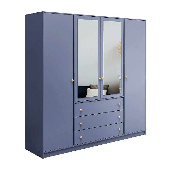 The SIENA II D4 wardrobe in dull blue is both elegant and practical, featuring 4 hinged doors, two of which are mirrored to enhance your room’s light and space. Made from durable 16mm laminated chipboard, this wardrobe is built to last and is easy to maintain. The golden knobs add a touch of luxury and sophistication, elevating the wardrobe's overall aesthetic. Perfect for any bedroom, the SIENA II D4 offers a stylish storage solution with a modern design.