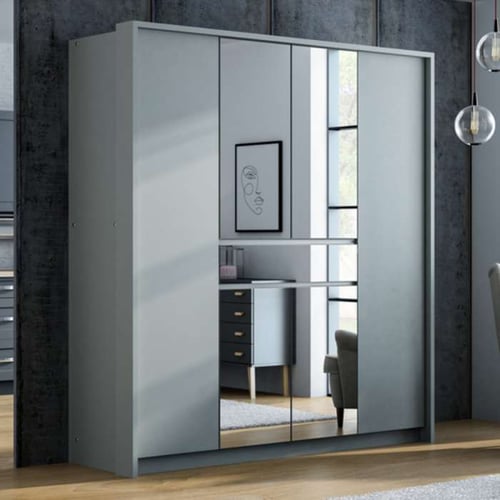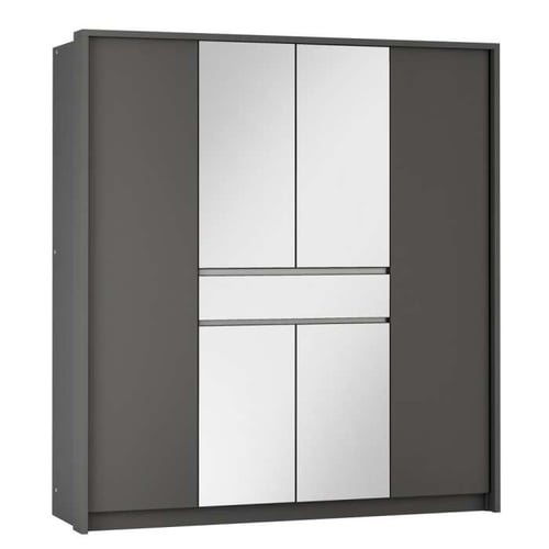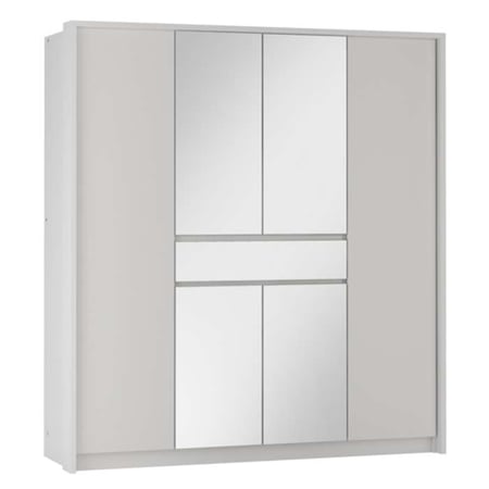 Crafted from durable 16mm laminated chipboard, this wardrobe boasts six hinged doors, with mirrors elegantly placed on the middle four to enhance light and create a sense of space. A thoughtfully designed drawer at the centre features a mirrored front, adding a stylish and practical touch. Inside, the wardrobe offers ample storage with shelves and hanging rails, making it a perfect blend of elegance and utility for your home.