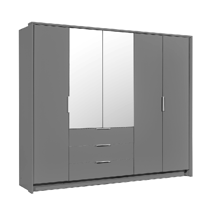 The TOGO 255 graphite wardrobe combines style and practicality with its 5 hinged doors, including 2 mirrored. Crafted from 16mm laminated chipboard, it offers durability and a sleek white finish that complements any décor while providing ample storage space for your essentials.