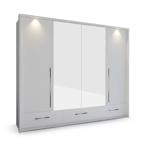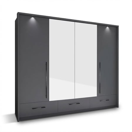 Overall, the graphite 255 TOLEDO wardrobe with bi-folding doors, mirrored doors, 6 shelves, 2 rails, 3 drawers, and LED lights is a practical and stylish storage solution for your clothing and other belongings. Its sleek design, versatile storage options, and thoughtful features make it a valuable addition to any bedroom or dressing area.